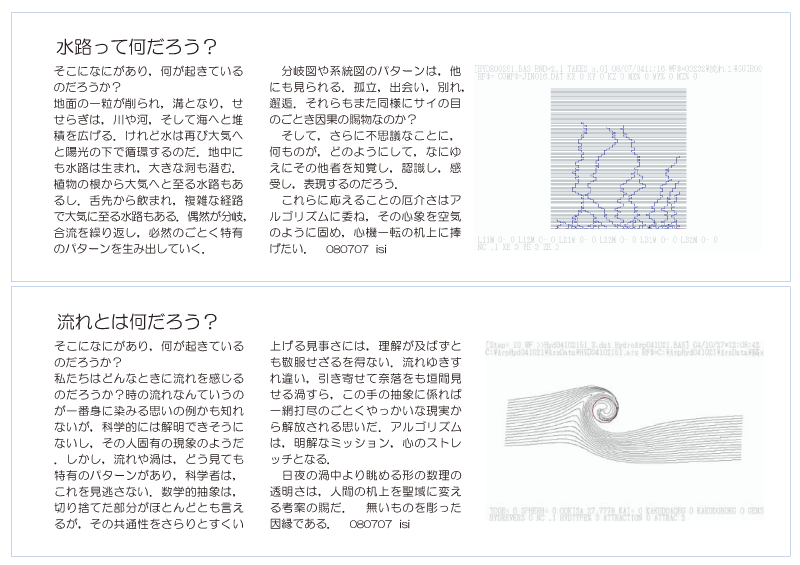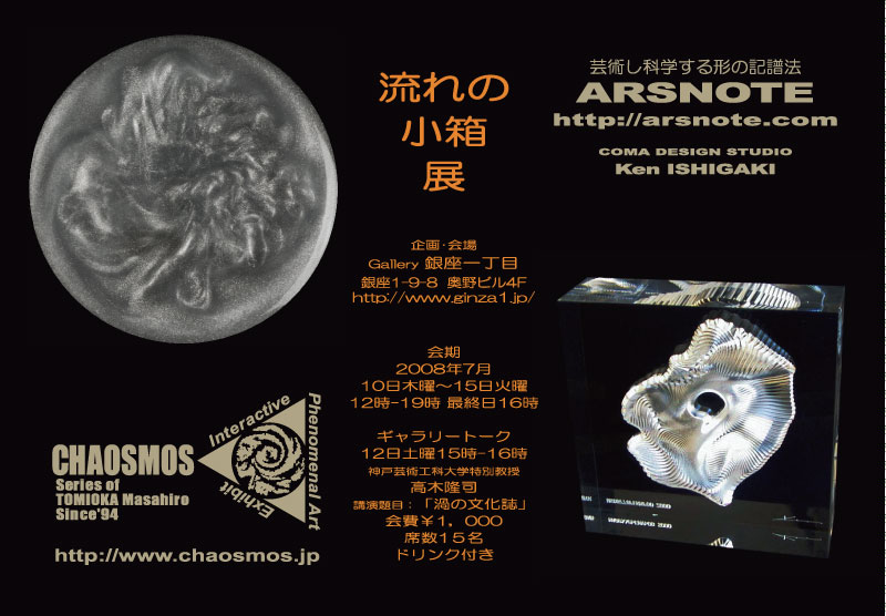 12日(土)の高木先生のギャラリートークは,流れから渦の生じる科学的で明解な説明と文化的視点から見る渦の表徴性について,縄文,直弧文,「紫式部日記絵巻」などを例に,推測も交えた楽しいお話しがありました.質疑応答終了後も意見交換は続き,外の激しい雷雨にも気付かず,よく学び,よく遊べた,熱い一日でした. isi |